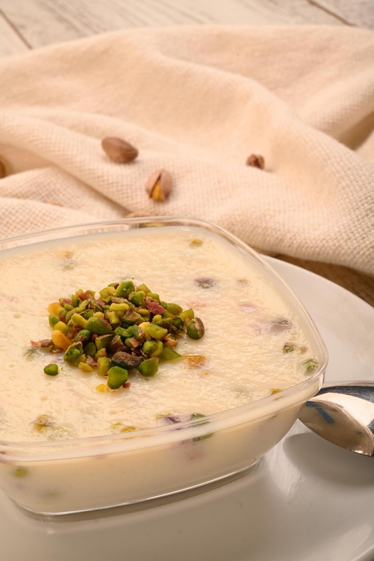 Fıstıklı Muhallebi, Asırlık Tarifine Sadık kalınarak Doğal Manda Sütüyle Hazırlanır.